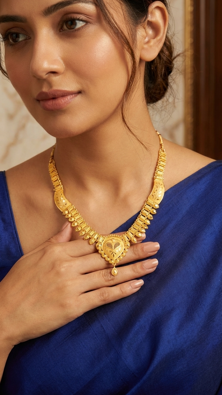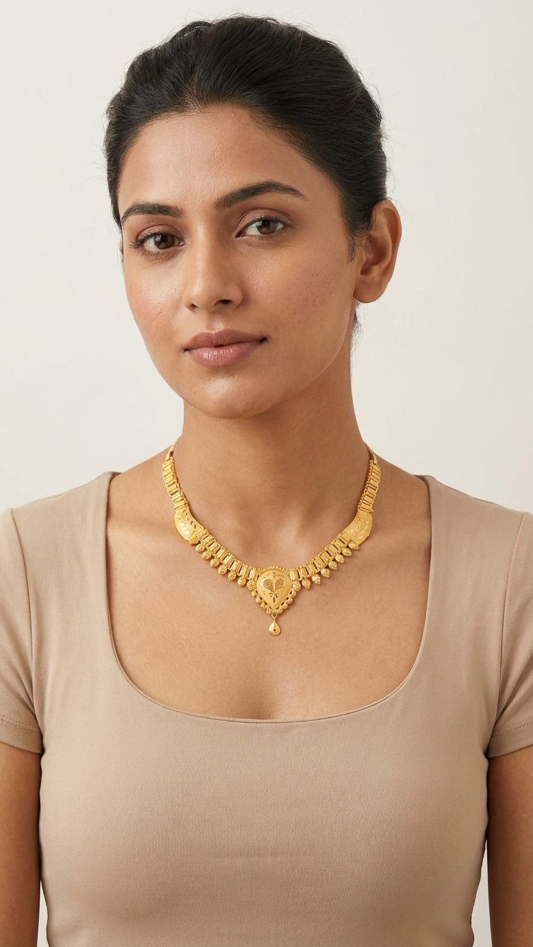 Crafted for the modern woman who appreciates subtle luxury, this 5.14-gram gold necklace from JMD Jewels is the perfect blend of traditional artistry and contemporary design. Designed to be lightweight and comfortable, it offers a sophisticated look without the weight of heavy bridal sets, making it ideal for daily wear or intimate gatherings.