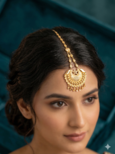 Design Theme: The “Chaand Taara” (Moon and Star) motif represents eternal grace and light. The “Teeka” style often features intricate gold beadwork and sharp, defined edges that give the piece a bold, royal presence.