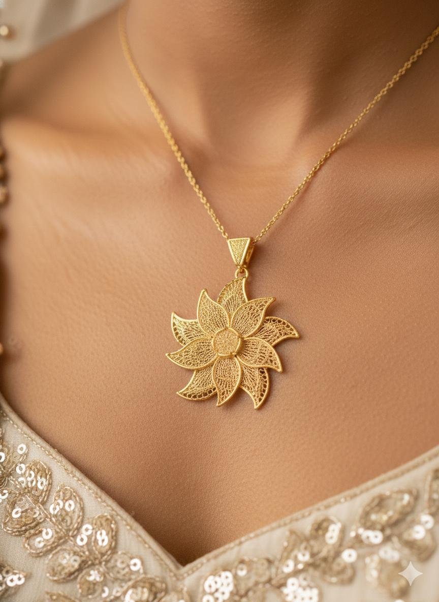 This looks like a professional product listing or tag for an exquisite piece of jewelry from JMD Jewels. Here is a breakdown of the specifications for your Turkish Floral Gold Pendant: